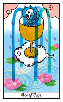 「カップ・エース」は、気持ちや感情または愛情が生まれてきた状態です。みずみずしいお魚がカップの中で微笑んでいます。エースはどのスートも最も純粋で、テンション高く舞い上がります。好きな人が出来た!夢中になれることをみつけた!というトキメキが心を躍らせています。泉から噴水のようにあふれる気持ちはピュアな喜びと豊かな感性を育みます。誰かと付き合い始めたとか、具体的に何かを始めたとか、まだターゲットがあるわけではありませんが、何かに目覚めたことに嬉しさを感じている状態です。
