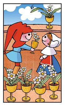 「[[カップ 6]]」で過去から未来に向かおうとしている途中いろいろなものと出会います。人生にはいろいろな可能性があることを知り、あれこれ夢の中で思い描くことにあふれています。決めたかと思えば、今よりもっといいことがあるのではないかと次から次へ思い描いては消すの繰り返しです。そんな調子で夢や憧れを抱いているだけで、実体がひとつもありません。彼が後ろ姿で影になって描かれているのは、自分自身が何を望んでいるのか分かっておらず、まだ無意識の中にいるからです。これだというものに出会えたとき彼の体に光りが当たるでしょう。